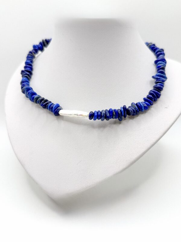Un collier qui invite au voyage associant la profondeur du lapis Lazuli à l’élégance d’une perle de culture. Un mélange inspiré par la mer.