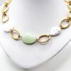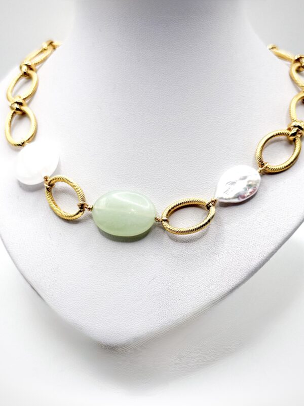 La pierre centrale apporte une touche de douceur qui contraste avec la structure graphique du bijou.