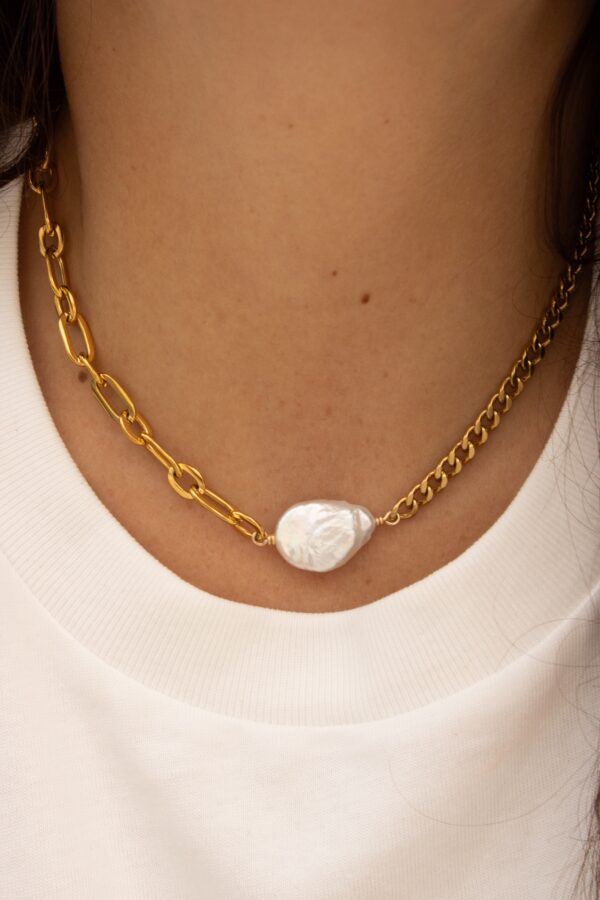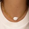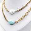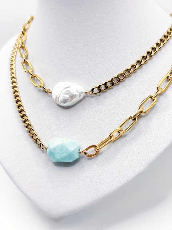 Deux chaînes asymétriques qui créent un jeu de contraste moderne, sublimé par une pierre ou une perle de caractère. Un bijou original et plein de style